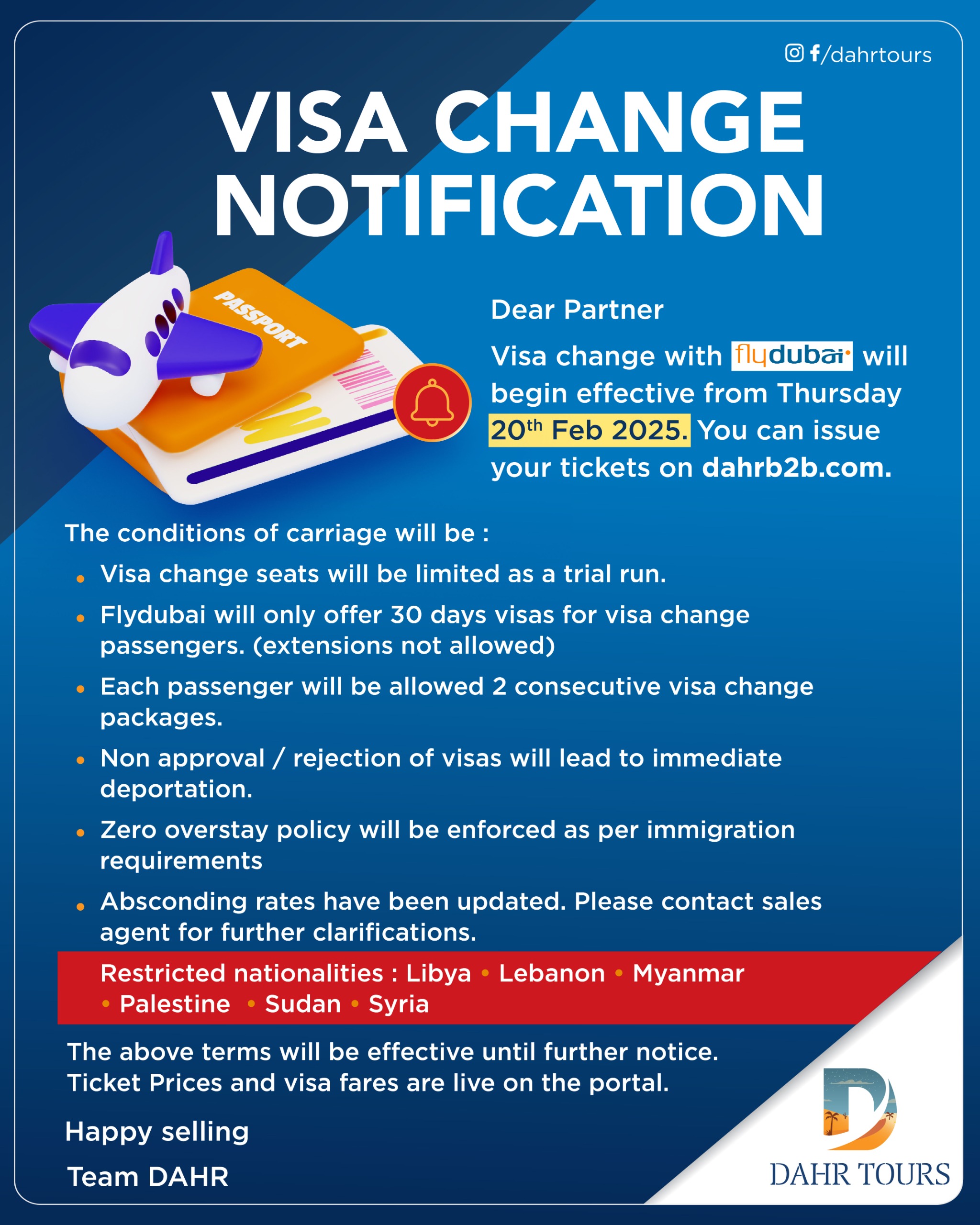 Please be informed UAE visa change services will resume from 20th FEB- 2025 onwards.